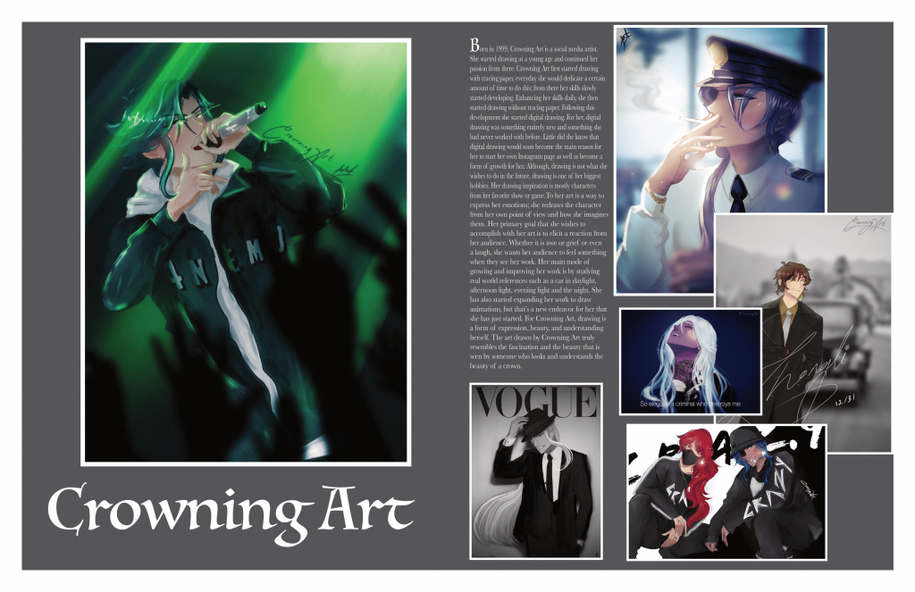 Dive into the captivating world of Crowning Art with our latest magazine edition, where creativity meets contemporary design. Featuring a palette of grey, this issue immerses you in a serene yet dynamic aesthetic that complements the artist’s bold and intricate work. The page is a visual symphony, showcasing Crowning Art’s stunning pieces in a vibrant collage format. This curated collection not only highlights her artistic evolution but also harmonizes beautifully with the magazine’s chic, modern layout. Enjoy a unique glimpse into the imaginative realm of an inspiring artist.